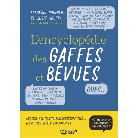 De A à Z, plongez dans l'univers des gaffes les plus folles. Perles du bac, bourdes de politiciens et diplomates, fautes d'orthographe et boulettes de jeux télévisés, voici une encyclopédie qui n'épargne personne ! Tous les domaines y passent. Cette compilation des gaffes et bévues, drôles et gênantes à la fois, est la garantie de fous rires... et complètera votre stock de blagues à ressortir en tout temps.