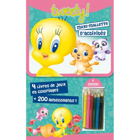 Une grande mallette à emmener partout avec toi contenant 4 livres. Deux livres de coloriages originaux, un livre de jeux et activités puis un livre de + de 200 autocollants Tweety pour tout décorer. Tu as aussi 6 crayons de couleur afin de laisser ta créativité s'exprimer.