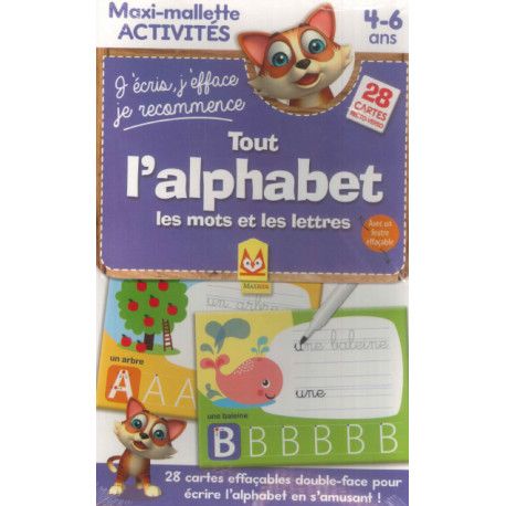 Une grande mallette à emmener partout avec toi. 26 grandes cartes éducatives double-face colorées et joliment illustrées. Chaque carte présente un mot illustrant une lettre ainsi que la lettre majuscules à tracer. Ces cartes effaçables sont un outil idéal pour jouer et apprendre en toute autonomie la découverte de l'alphabet, le tracé des mots et des lettres. Le coffret contient aussi 1 feutre effaçable + grande carte poster de l'alphabet + 1 ardoise effaçable.