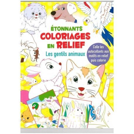 Complète les pages avec les superbes autocollants aux motifs en relief puis colorie les images en suivant les couleurs des contours.Tu obtiendras de superbes coloriages très originaux !