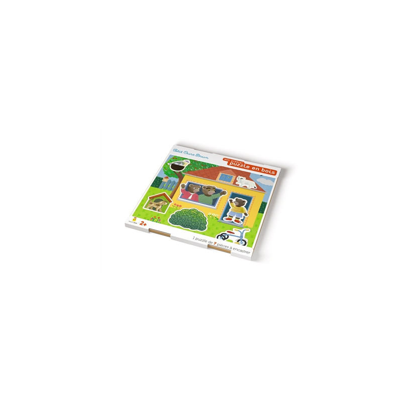 Un puzzle de sept pièces en bois à encastrer représentant la maison de Petit Ours Brun.